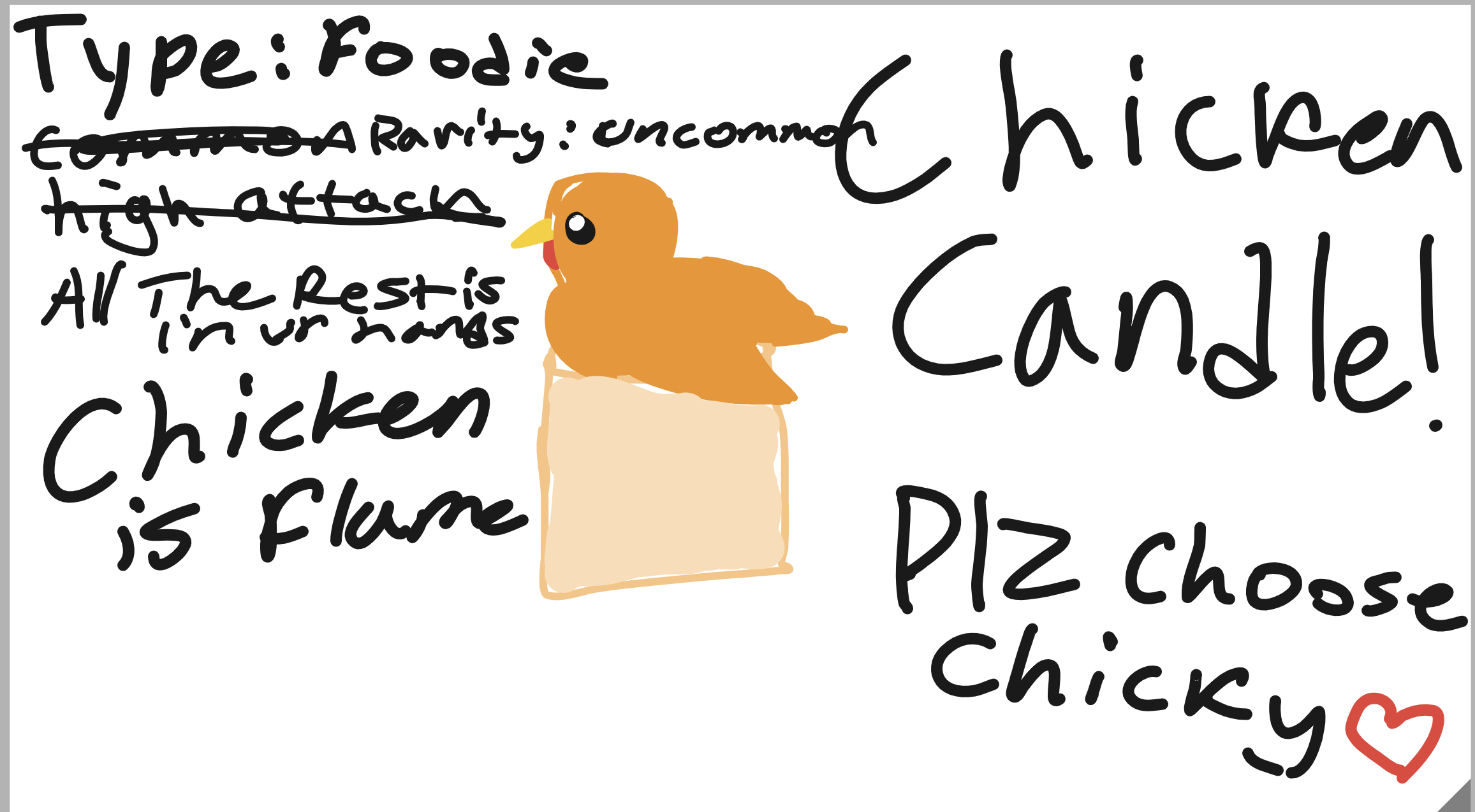 Description: Chicken Candle, Born from a Chef trying to make a Candle, Chicken Candle hypnotizes it’s enemy’s with it’s delicious aroma, then strikes with it’s pecks of flame!