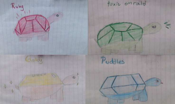 Discription: Hi I’m Ruby and am a part of The Quadruplet Turtles my siblings are Toxic emrald,Goldy and Puddles, I was insipered by the gem known as the ruby so watch out because my shell will shine.
